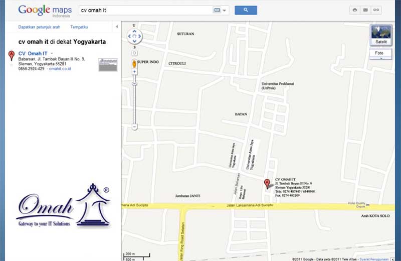 Alamat CV.OMAH IT yaitu di Jalan Tambakbayan 3 Babarsari Depok Sleman Yogyakarta 55281. Apabila ingin menghubungi kami bisa melalui web kami Klik Disini atau melalui telepon kami dengan nomor (0274) 487443 | 6840960 atau Fax (0274) 485209