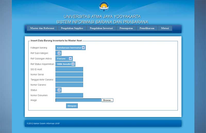 Sebuah perangkat lunak (software) yang di design untuk membantu pihak pengelola Universitas Atma Jaya Yogyakarta dalam mengelola data para mahasiswa dan mengembangkan kefektivan kinerja serta untuk membantu pihak pengelola Universitas Atma Jaya Yogyakarta dalam mengelola data inventaris barang-barang yang ada di Universitas Atma Jaya Yogyakarta, dimana sistem ini sudah didukung fitur yang lengkap seperti pendaftaran Item baru, penggantian item barang yang sudah rusak.